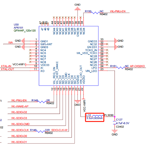 雖然這款貼片功率電感并沒(méi)有印字,但是,所使用的wifi模塊為AP6181,根據(jù)模塊配套電路,我們能夠了解到,這款wifi模塊電路中配套的貼片功率電感器參數(shù)為:3.3uH,800mA