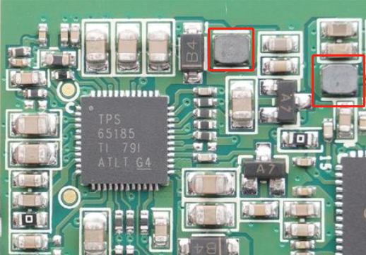 其次, 我們將視線轉(zhuǎn)移到閱讀器電路中,專門為E ink屏幕顯示設(shè)計(jì)的IC芯片,TI TPS65185,在這塊芯片的附近,我們也同樣能夠看見(jiàn)兩款沒(méi)有印字的貼片功率電感器。